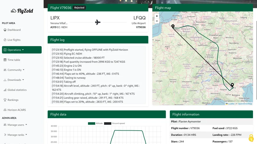 Nous avons créé une application SaaS complète permettant de gérer les utilisateurs, rôles et permissions, enregistrer et analyser les vols virtuels, visualiser des statistiques détaillées (temps de vol, activité, performance), administrer une compagnie aérienne virtuelle via des tableaux de bord dédiés et enfin d'automatiser les processus opérationnels. En plus de cette application SaaS, un logiciel spécifique a été développé afin d'extraire et d'analyser automatiquement les données de vol des simulateurs de vol.